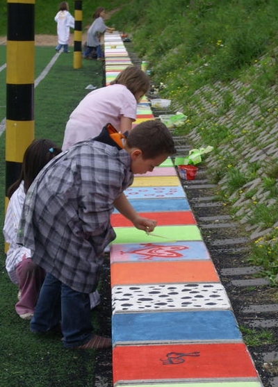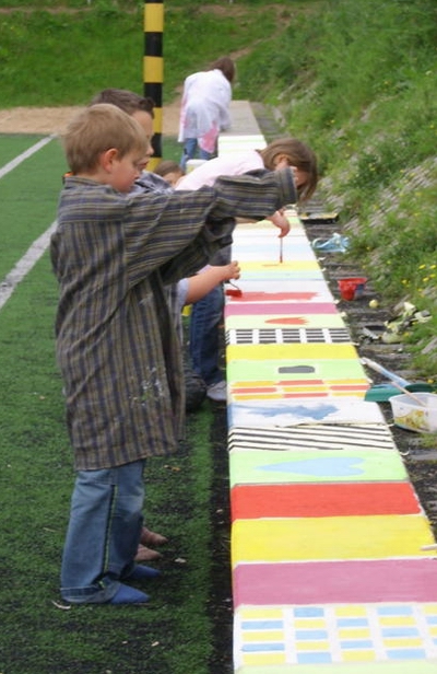 Die Kinder der Kunst-AG verschönern unter Anleitung von Frau Bergerhausen unseren Bolzplatz.