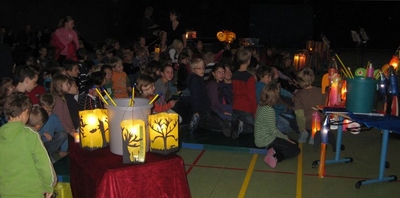 Heute morgen trafen wir uns zum Laternenfest in der abgedunkelten Turnhalle.