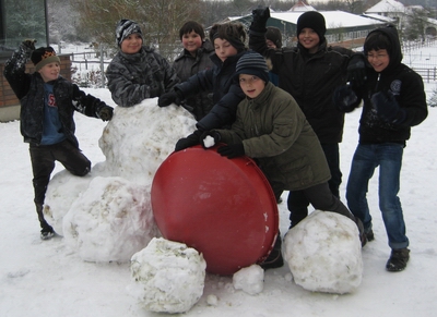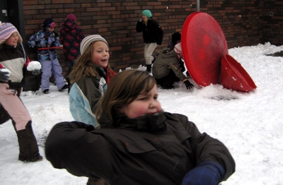 Den ergiebigen Schneefall der letzten Tage nutzen die Kinder der Klasse 4a