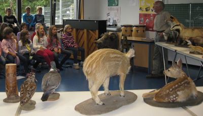 Der Musikraum wurde heute zum Ausstellungsraum umfunktioniert. Die „rollende Waldschule“ präsentierte den Viertklässlern ihre Exponate und die Kinder konnten viel über den Wald und seine Bewohner erfahren.