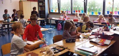 Traditionell bestehen an unserer Schule Patenschaften zwischen den ersten und den dritten Klassen. Es finden z.B. gemeinsame Spielstunden, Bastelaktionen oder Vorlesestunden statt. Die Eulenklasse (3a) und die Hundeklasse (1b) bastelten mit viel Ausdauer und Spaß gemeinsam die Herbstdekoration für die Flure.