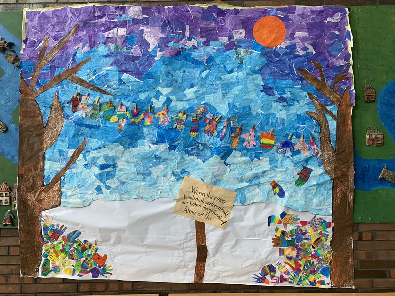 Jedes Kind hat mindestens einen bunten Handschuh gestaltet. Der Himmel und die Bäume entstanden aus einzelnen Teilen, an denen alle Kinder mitgearbeitet haben.