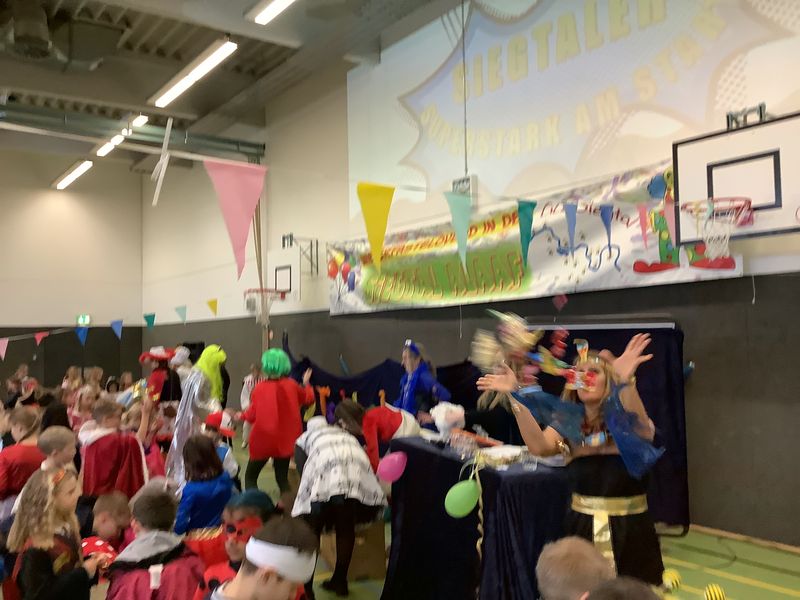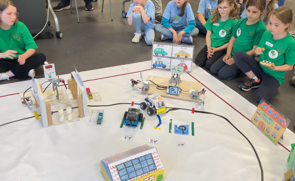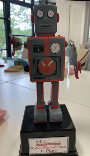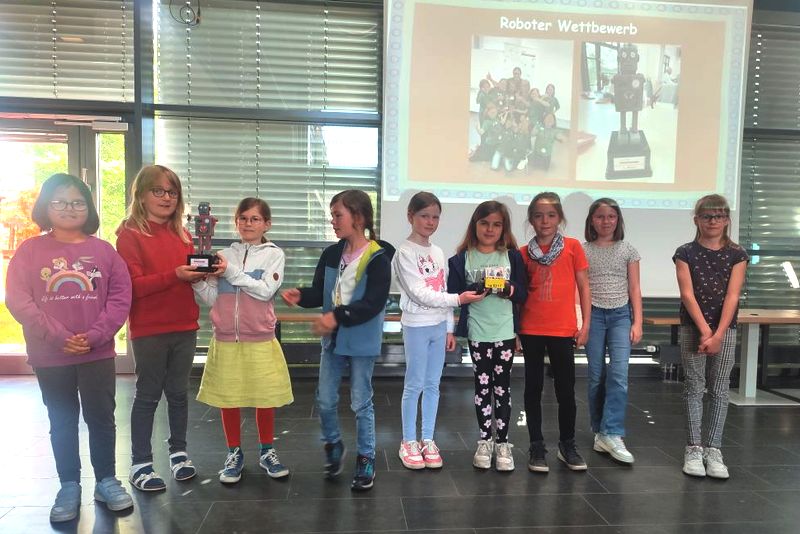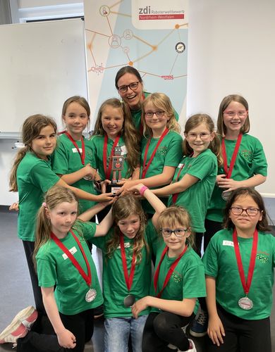 Nach dem tollen Erfolg beim Regionalwettbewerb konnte die Roboter-AG sich auch beim Finale in Mühlheim an der Ruhr beweisen. Die großartige Performance der Gruppe bescherte ihr den ersten Platz in ihrer Kategorie. Neben einem Pokal gab es auch einen Zuschuss von 600 € für MINT-Aktivitäten der Schule. Voller Stolz nahmen die Mädchen den Preis von einer Vertreterin des Schulministeriums an.