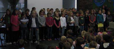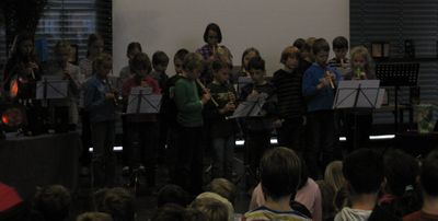 Das heutige Martinssingen war ein voller Erfolg. Im stimmungsvoll geschmückten Foyer wurden gemeinsam Martinslieder gesungen. Außerdem führten die Flötengruppe, der Chor und die Kinder der Klasse 2a eingeübte Stücke vor.